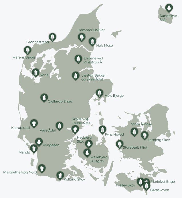 På Danmarkskortet kan du se, hvor Naturfonden allerede har opkøbt 26 naturområder rundt om i landet. Alle områder er købt med bidrag fra privatpersoner og virksomheder, som ønsker at beskytte dansk natur.